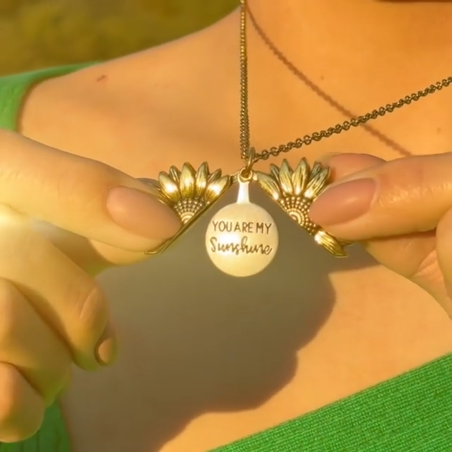 This beautiful necklace carries a secret note. The sunflower locket opens up to reveal the loving words: